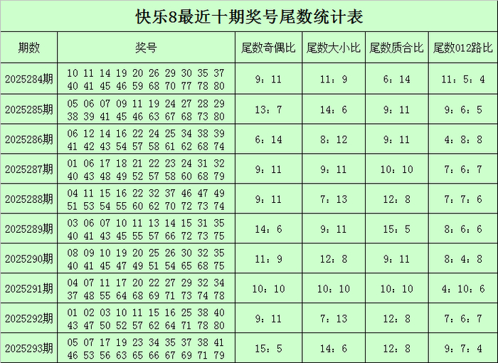 陆白秋快乐8第2025294期奖号尾数分析