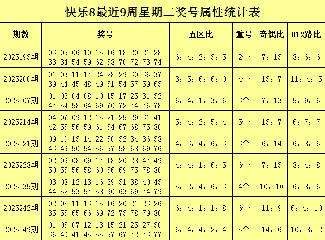 福彩快乐8第2025249期(上周二)奖号回顾:01 06 07 12 13 15 21 25 27 30 36 40 41 45 55 57 67 72 73 77,其中奖号奇偶比为14:6,五区比为6:4:4:2:4,012路比为10:8:2,包含5个重号13、15、21、72、73。