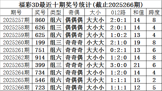 开奖回顾:福彩3D第2025266期奖号为723,奖号形态为:组六、大小小、1:1:1、奇偶奇。