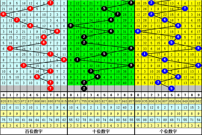 第三位上期开出奖号3,走小3点,本期注意该位走大,关注号码5。