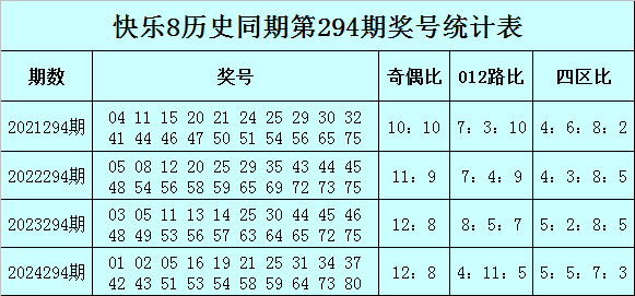 奇偶比分析:第294期历史同期奖号奇偶总比为45:35,奇数号码走势较热,去年同期奖号奇偶比开出12:8,今年第294期看好偶数热出,推荐奇偶比9:11。