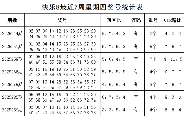 福彩快乐8第2025289期(上周四)奖号回顾:03 06 07 10 11 13 14 15 31 35 40 41 43 45 55 57 66 72 73 75,其中奖号四区比为8:3:5:4,012路比为8:8:4,包含4个重号15、35、66、72,包含连码06 07、10 11、13 14 15、40 41、72 73。